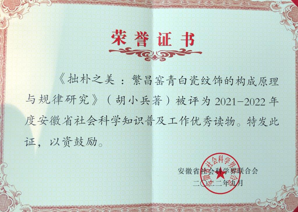 9月15日,安徽省第十八届社会科学知识普及活动月开幕式在黄山市举办,beat365唯一官方网站教授胡小兵新作《拙朴之美:繁昌窑青白瓷纹饰的构成原理与规律研究》(中国陶瓷2022年第三期刊载)被评为“安徽省社会科学知识普及工作优秀读物”。