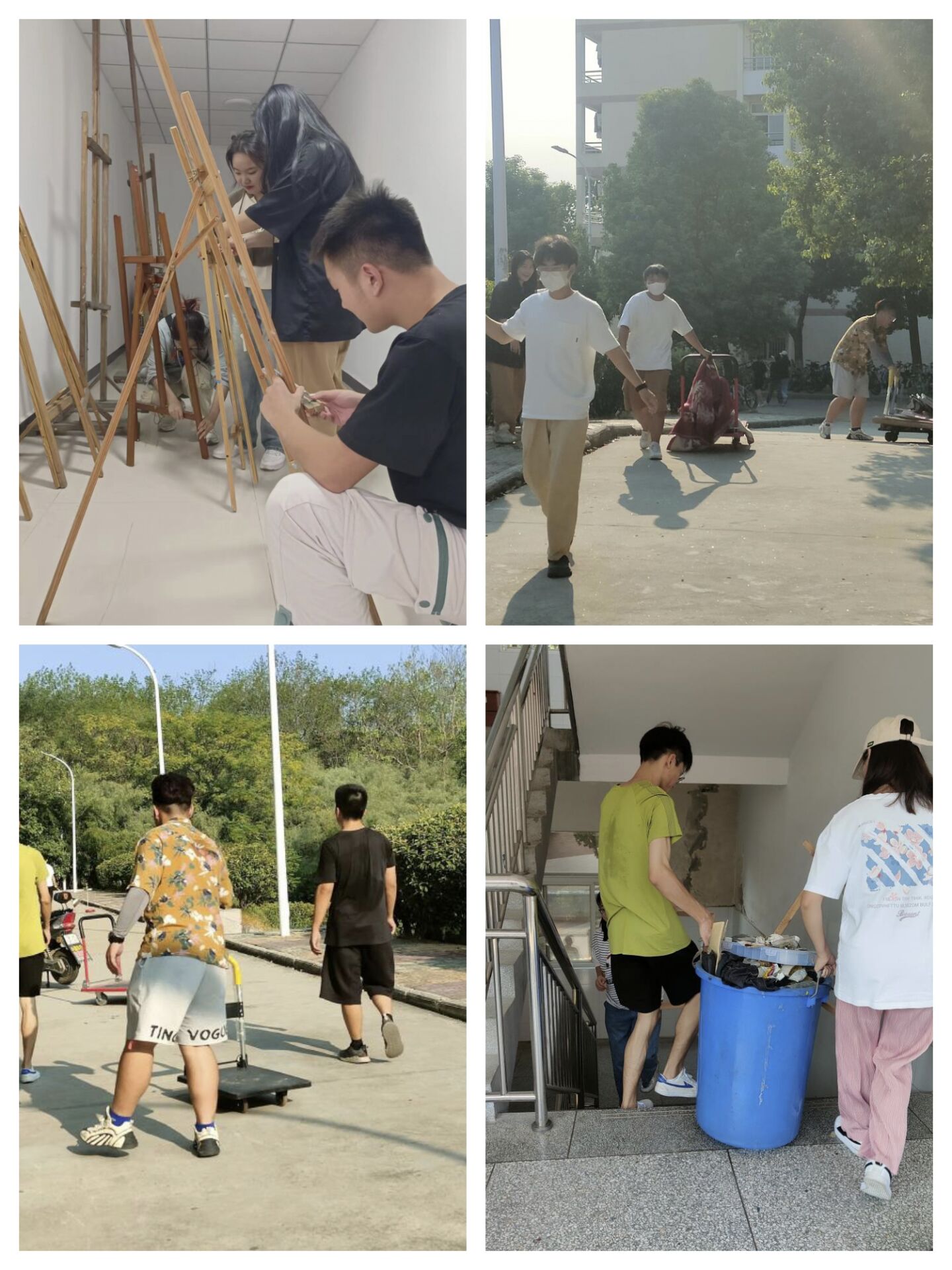 除了教室的大扫除,9月21日,学院学生们还自发组织在来到教学楼各画室维修破损画架。短短两个小时,7位同学用自己的“巧手”将十几个画架“变废为宝”。谈及活动初衷,动画专业2021级的汪润表示,新生军训即将结束,随之而来的便是专业课的学习,画架是美术生学习的重要工具,自己发现许多画架还能“抢救”,便自发组织了“维修小分队”,希望能给新生们一个更好的学习体验。