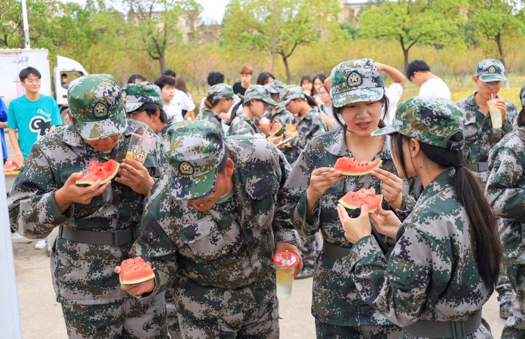 “谢谢学长学姐!”“西瓜好甜呀!”“柠檬水酸酸甜甜的,真好喝!”……收到冷饮和西瓜的新生们纷纷向学长学姐表示感谢。来自设计学专业2022级(3)班的刘静晨对此深有感触:“学长学姐们的‘送清凉’活动太暖人心了!”在她看来,这样的“清凉”在消除军训疲惫感的同时,更抚平了自己内心的燥热。“非常感谢老师和学长学姐们的关心,这将成为我军训期间最美好的回忆。”