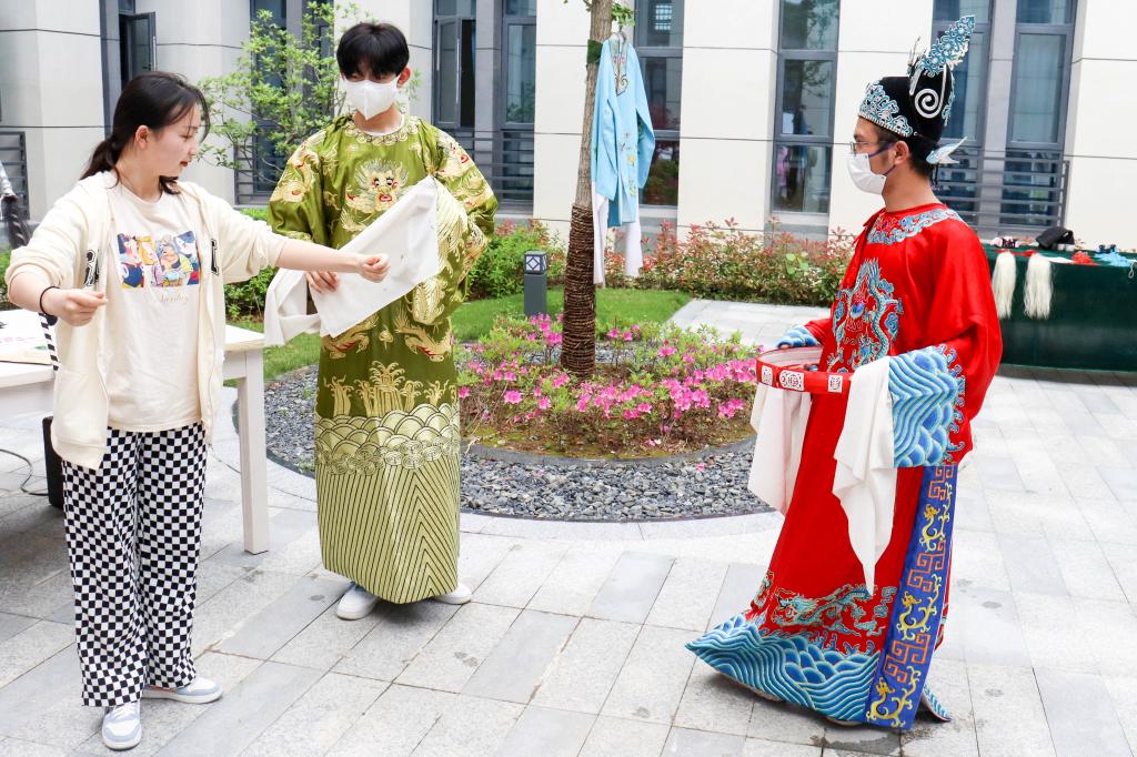 戏服、鞋帽、盔头、髯口……学院教学楼一楼庭院里,精美华丽的戏曲行头吸引了过路人的注意,“大家可以选取自己喜欢的戏服和道具,我们会为同学们提供上妆服务。”戏曲舞美与设计专业2020级硕士研究生吴振亚作为活动负责人介绍,自己和团队事先向黄梅剧艺术学院借用了20余套戏服和许多道具,希望同学们能够积极尝试,感受戏曲服饰魅力。