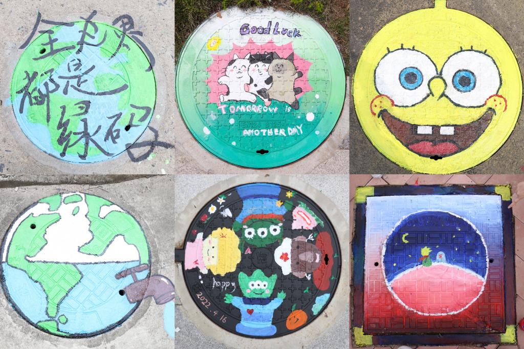 清理井盖、调配颜料、勾勒线条、组合上色、涂罩光漆,设计学类专业2021(2)班的肖梦瑶与其他四人合理分工,短短两个小时,就完成了作品。井盖上,“全世界都是绿码”的字样印在了蓝绿色的地球上,谈及创作初衷,肖梦瑶解释,新冠疫情的出现给人们的生活造成了极大的困扰,希望疫情能够早点消失,人们可以早日回归正常生活。