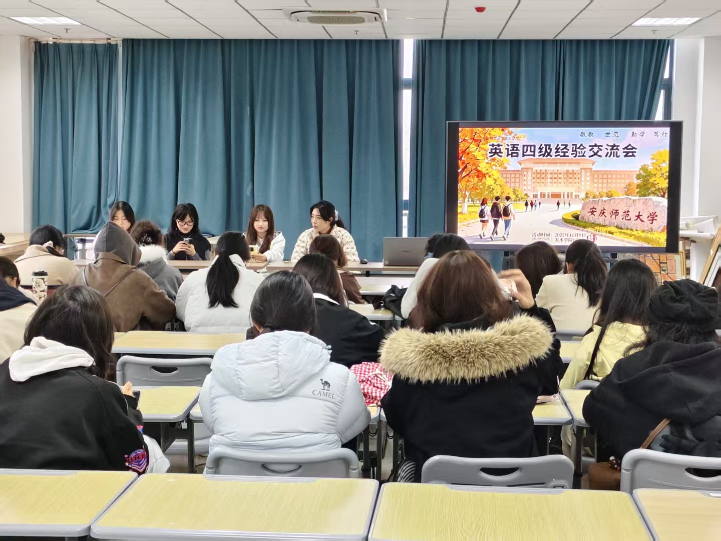 11月9日,beat365唯一官方网站学生会在新美术楼P210举办英语四级考试经验交流会,活动邀请了beat365唯一官方网站4名已经通过英语四级考试的同学进行经验交流和分享,2025级新生参加了此次活动。
