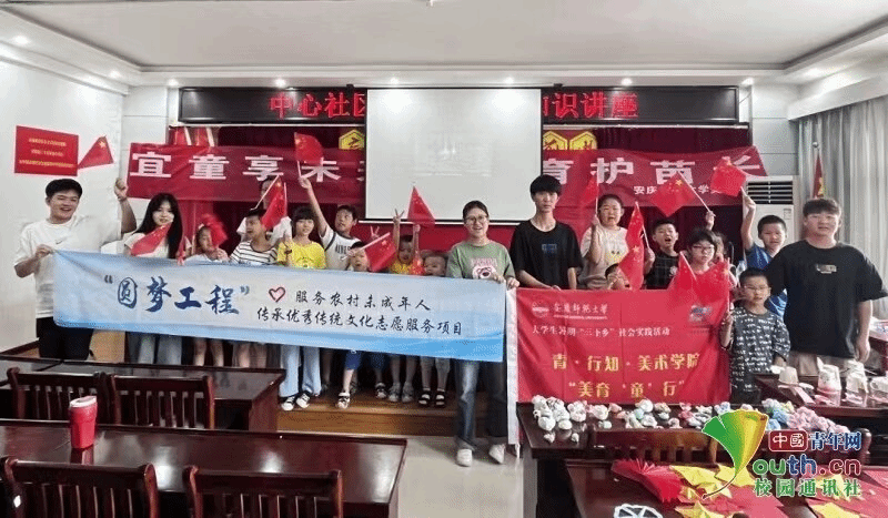 2023年7月,青·行知“美育‘童’行”暑期社会实践团成功入选2023年“圆梦工程”服务农村未成年人传承优秀传统文化志愿服务团,团队立足美育实践,面向社区儿童,以课堂为载体,深入开展红色精神宣讲、趣味艺术体验、传统文化学习等系列活动,为“以美化人”提供坚实落脚点。