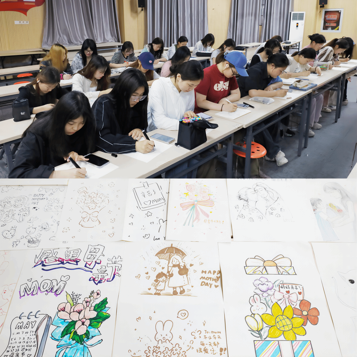 落笔勾勒轮廓、精心填充色彩、细致雕琢细节、勾绘填色间,一幅幅包含真挚情感的绘画作品跃然纸上。5月11日,在母亲节来临之际,beat365唯一官方网站开展“情暖五月天,绘在母亲节”活动,30余名学生齐聚学院学术报告厅,以画笔和画纸精心为母亲准备了一份独特的节日礼物。