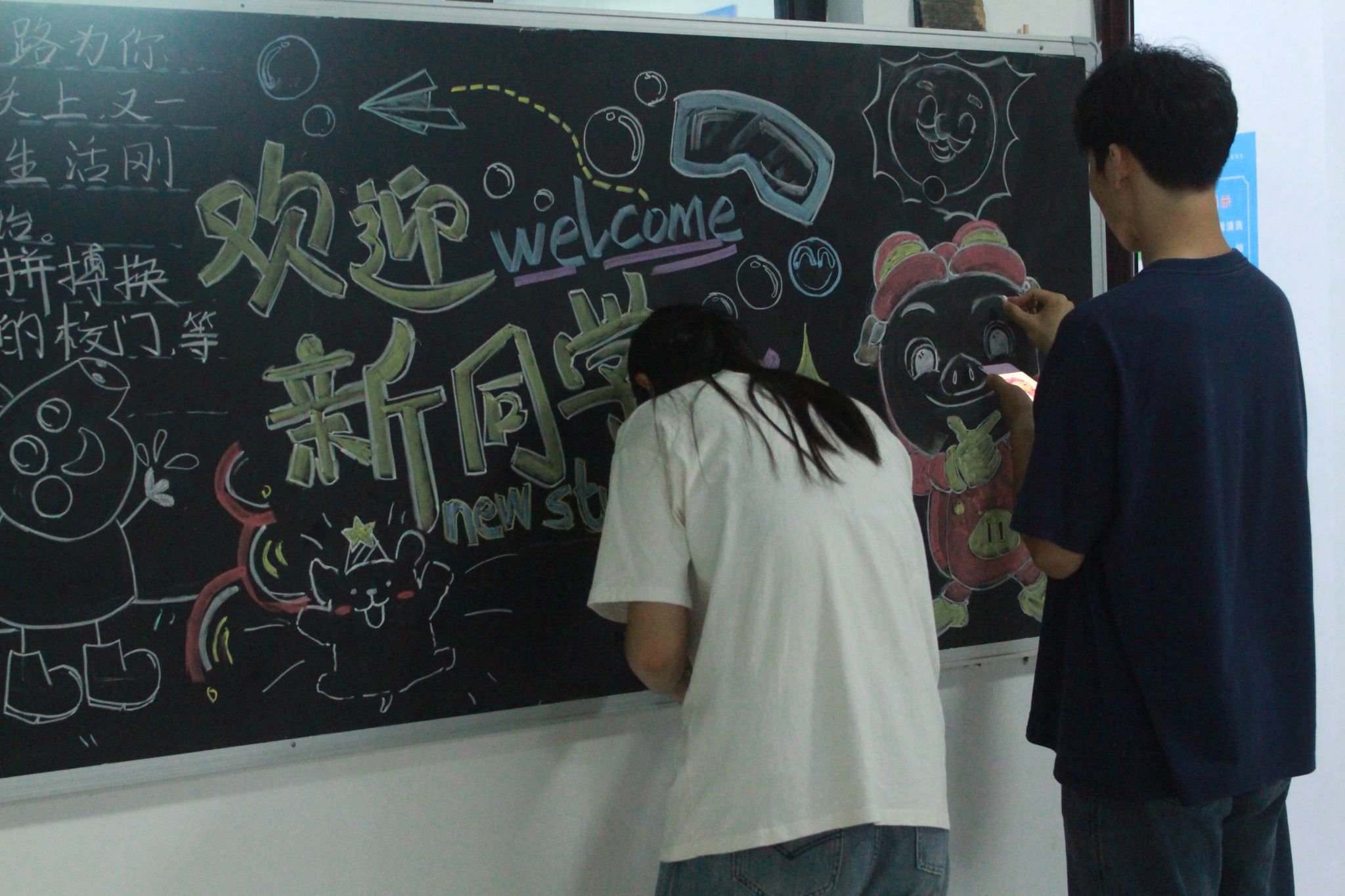 为确保迎新工作的顺利进行,学院提前一星期发布招募相关志愿者的通知,并着手规划设计各宿舍楼黑板报具体内容,购买粉笔、黑板擦等工具。32名志愿者4人一组,在课余时间前往指定宿舍楼绘制板报。花团锦簇的边框象征“花路”、栩栩如生的椰树送来清凉、晶莹剔透的漂流瓶承载梦想……不到两天,原本布满灰尘的黑板便焕然一新。