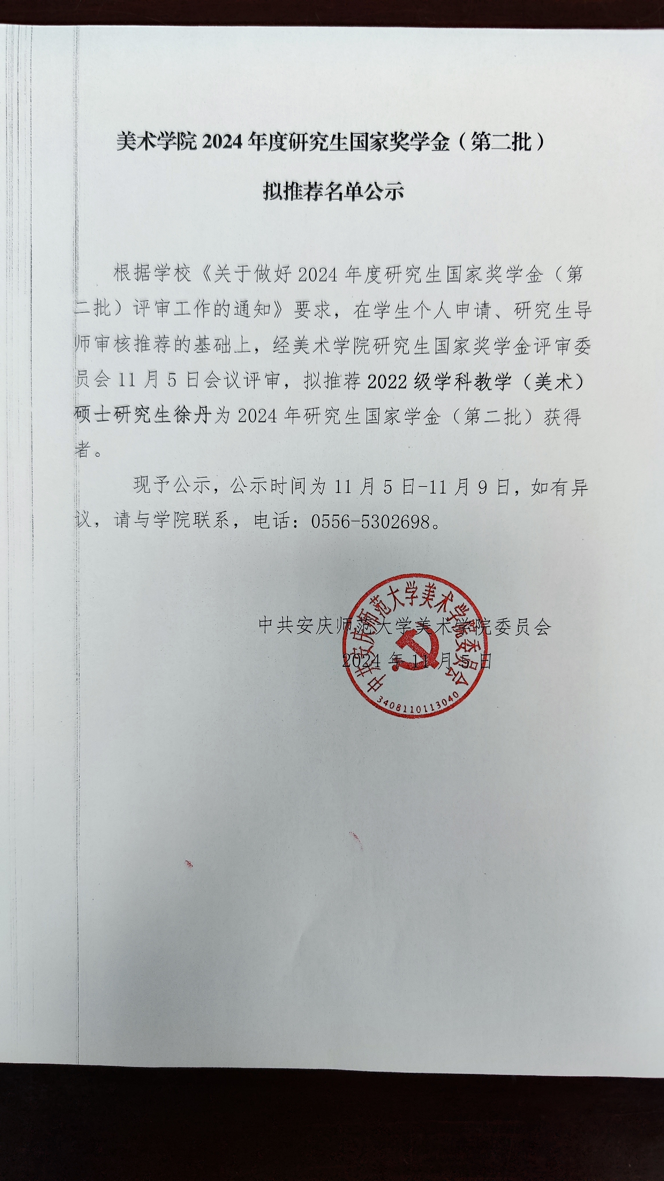 现予公示,公示时间为11月5日-11月9日,如有异议,请与学院联系,电话:0556 - 5302698。