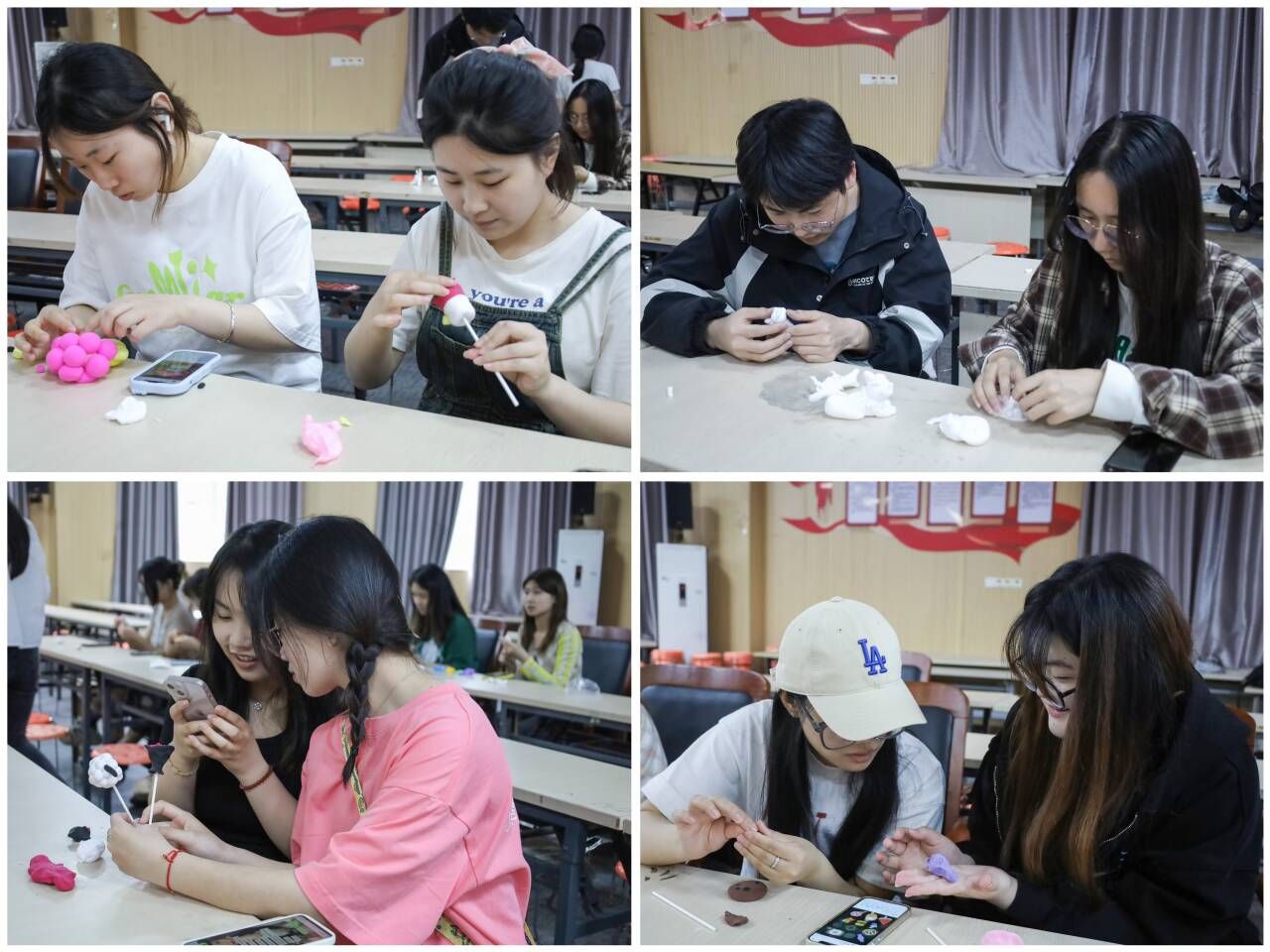 “我自己在心情低落时喜欢以做手工来消解情绪,所以希望能够通过开展这一手工活动,让参与学生在制作黏土摆件中释放情绪压力。”活动负责人、环境设计专业2022级的李佳妮表示,为了让参与学生在创作时拥有更多元的选择,早在一个月前,学院学生会工作人员便对活动内容进行调研规划,并采购多色黏土、泡沫球、纸棍以及插座展示架等材料。