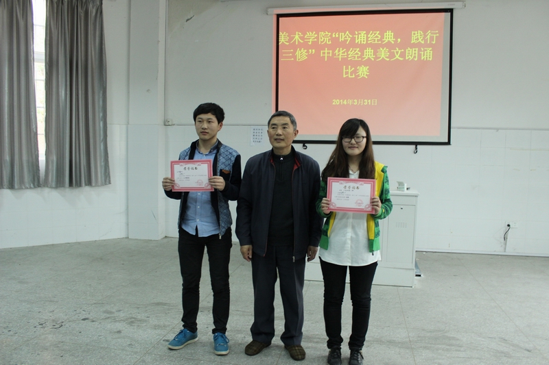 此次比赛设个人诵读和团体诵读两组。经过两个小时的激烈角逐,2013级美术2班孙定国同学的《雨巷》获个人朗诵一等奖,2013级动画1班《我的中国梦》获集体朗诵一等奖;2013级动画1班苗振雨《父亲》等获个人朗诵二等奖,2012级动画2班李飞、王杏组合《我的南方北方》等获集体朗诵二等奖;2013级环境设计专业王飞《跳伞塔》等获个人朗诵三等奖,2013级视觉传达班郑伟、王蓉等6人组合《长恨歌》等获集朗诵三等奖。