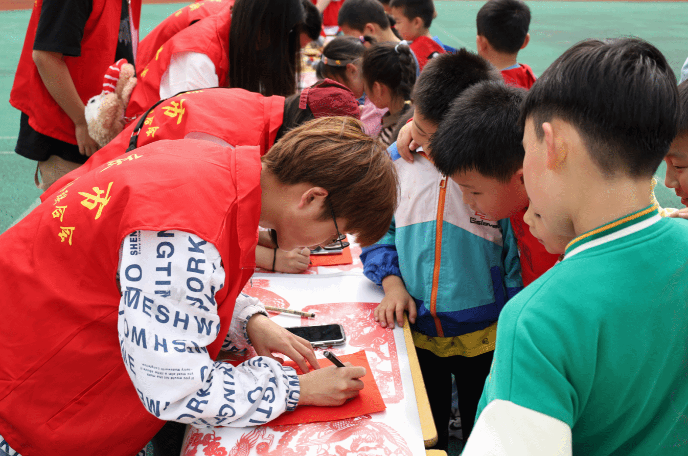 勾勒轮廓、加深线条、分区裁剪……设计学类专业2022(3)班的张顺心提前在纸上画好“虎头”“牡丹花”等图案,供孩子们挑选制作。为了让文化知识更加深入人心,张顺心化身剪纸“小老师”,结合剪纸作品进行讲解,向在场学生介绍了剪纸的历史起源与发展传承。“剪纸作为非物质文化遗产是我们珍贵的财富,需要大家共同传承。”