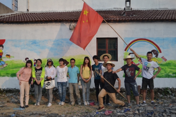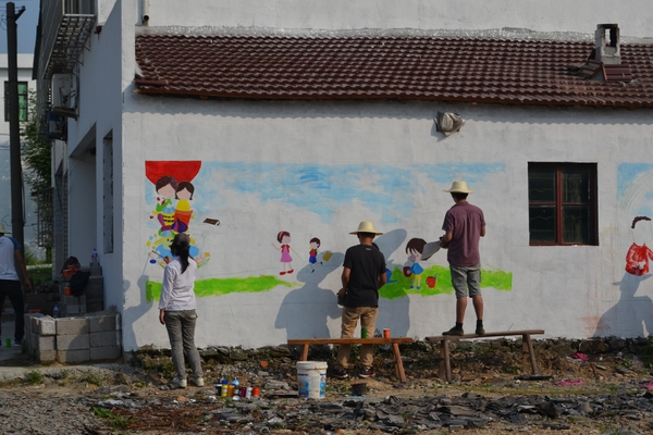 烈日炎炎,大家都认真地绘图,一笔一线,一丝不苟。经过长达两个星期的施工,墙绘终于完成。学生们良好的专业素质和认真敬业精神受到了当地政府的好评。